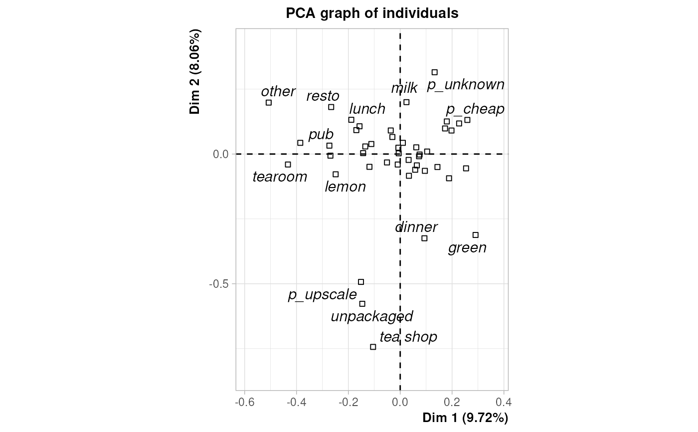 plot(mcaoiv, choix = "ind", invisible = "ind", col.quali = "black")