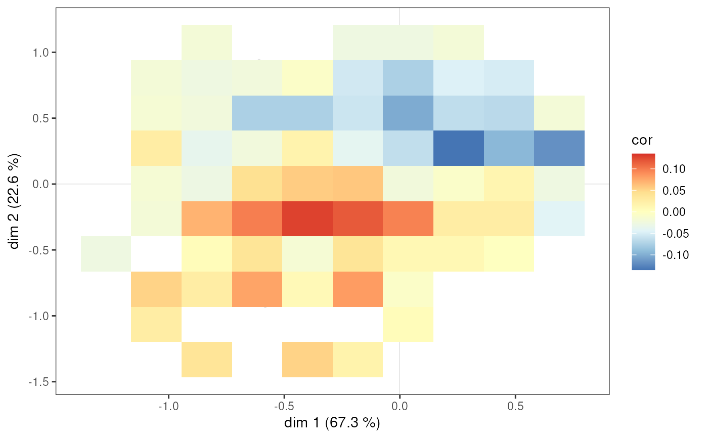For each tile of the heatmap, a correlation coefficient is computed between the supplementary variable and the fact of belonging to the tile. This gives a view of the under/over-representation of the supplementary variable according to the position in the cloud of individuals.