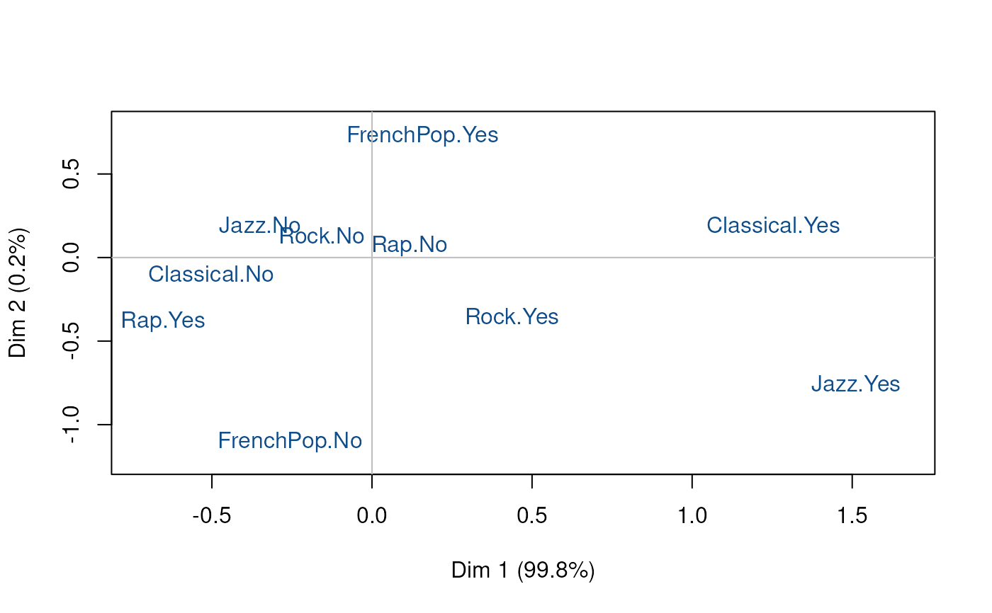 mca <- csMCA(Music[,1:5], subcloud = female, excl = junk)