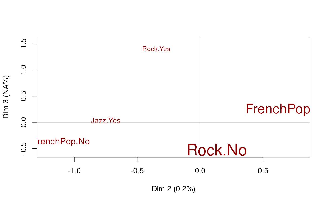 plot(mca,axes=c(2,3), points = "besthv", col = "darkred", app = 1)
